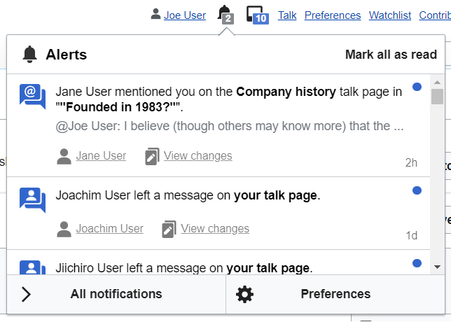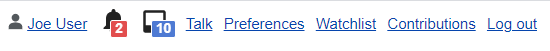 Figure 10.1: The top of the page of a wiki with the Echo extension installed, for a user who has 2 unread alerts (the red square over the bell) and 10 unread notices (the blue square over the paper tray)