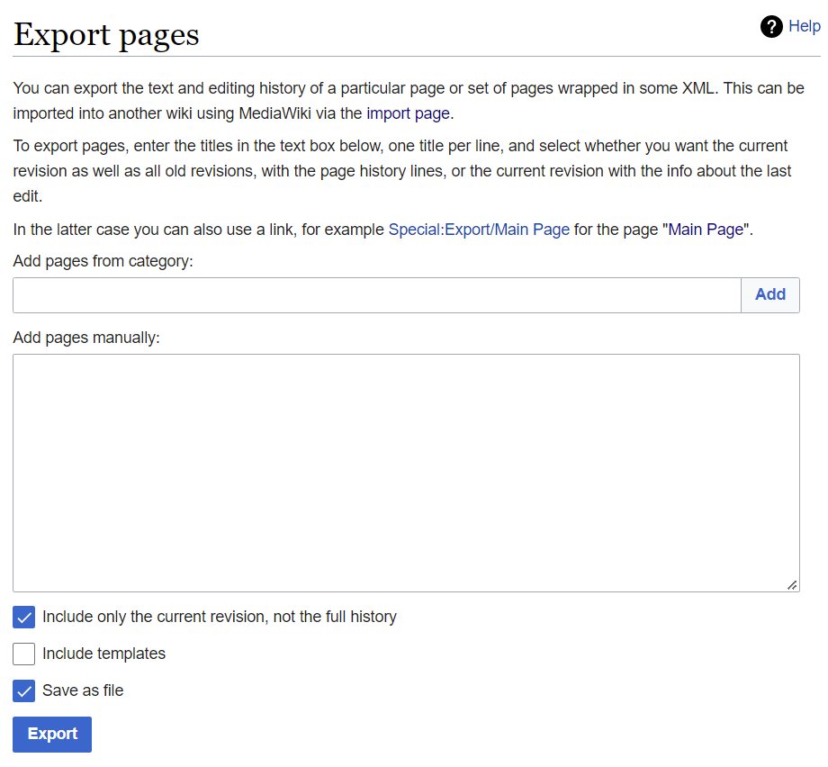 Special:Export (see Figure 19) lets you generate an XML file that holds the contents from any number of pages in the wiki. The XML is in a custom format defined by MediaWiki. Special:Export unfortunately doesn't provide an automatic way to export all pages at once. Instead, you assemble a list of pages to be exported; the page lets you add whole categories to the list. Once you've assembled the full list, you can choose whether to export just the most recent revision of each page, or all of them. The latter is certainly recommended when exporting from one MediaWiki wiki to another.