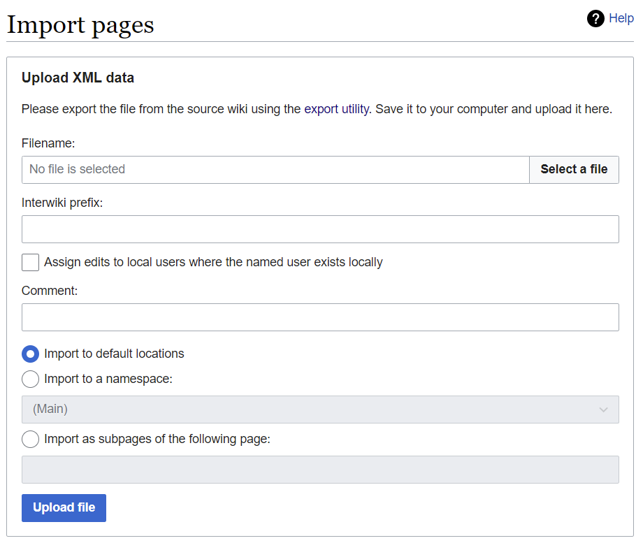 Once you have the XML file generated and downloaded, it's time for the second step, which, as you might have guessed, is to use Special:Import in the other wiki. That page is simpler – there, you just upload an XML file, and it generates all the relevant pages. See Figure 19 for the Special:Import interface.