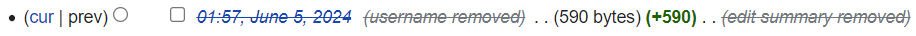 As you can see, in either case, there are three things that can be hidden: the text of the revision (the most important of the three), the revision summary, and the user who made the revision. Once a revision is hidden, neither administrators nor other users will be able to see the hidden elements of that revision; though they'll still be able to see that the revision happened. If all three of the above elements are hidden, here is how that row in the page history will look: