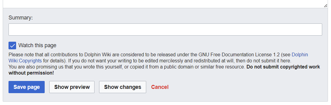 Here is what the bottom of the edit page looks like, below the main input for the text, for a fictional “Dolphin Wiki”: