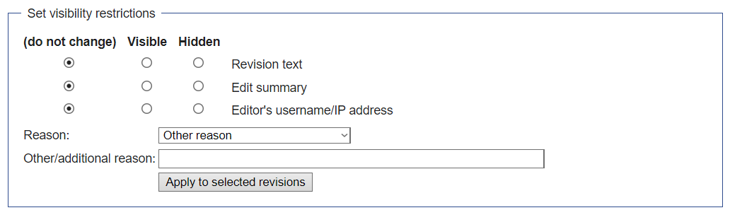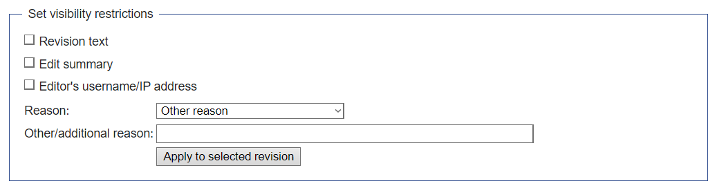 If you add this line, any administrator who's logged in will see another checkbox on each row, and another button above the rows, reading (in English) "Change visibility of selected revisions". Selecting any number of checkboxes, and clicking the button, will bring you to a page reading "Delete/undelete revisions". Contrary to its name, this page does not actually delete anything, but rather hides certain revisions (though, as we'll see later, regular page deletions don't actually delete any content either). The interface is slightly more complex if more than one revision has been selected. Figure 3 shows the interface for one revision, and Figure 3 shows it for more than one.