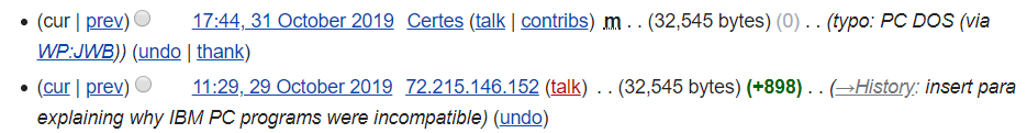 Here are a few rows from the history page for the article “Tandy 2000”, on the English-language Wikipedia:
