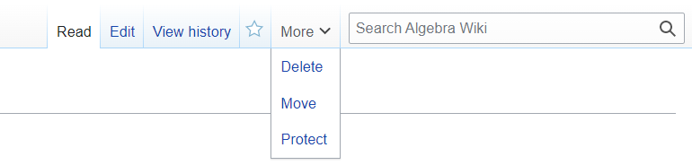 In MediaWiki, nearly all page-specific actions are accessible through what are usually tabs, though it depends on the skin: in some cases the “tabs” are just links displayed on the side, and in the case of Vector, which is the default skin, some of the tab actions are dropdown links, viewable alongside the main tabs. The exact set of tabs/dropdown actions/etc. one sees depends on the type of page it is, the permissions one has, and the extensions installed. Figure 3 shows the standard view of tabs and dropdown actions that an administrator would see, for a regular page in a fictional “Algebra Wiki”, with the Vector skin (along with the search interface alongside it, and a star icon in order to watch