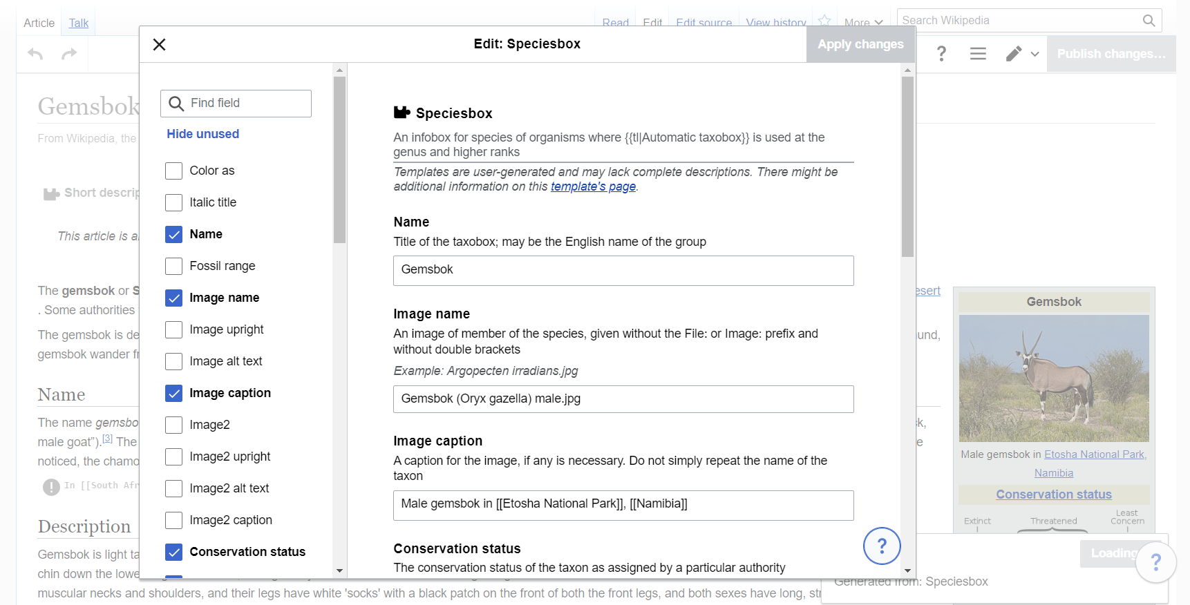 Figures 3 and 3 show different aspects of VisualEditor in use, on the same article in the English-language Wikipedia: the standard editing interface, here used to edit a link (note how similar VE's display looks to standard MediaWiki page appearance), and the interface to edit a template call, here for the main infobox for the page.
