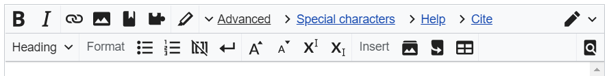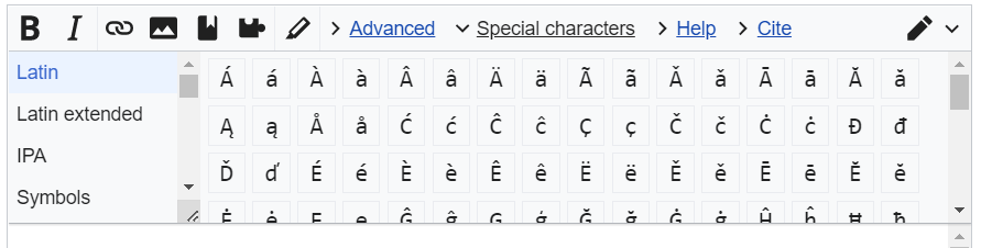 , which is bundled in with MediaWiki, is a fairly indispensable extension that provides a nice toolbar above the editing area with support for special characters (symbols, and non-Latin characters), and other features. Figure 3 shows what it looks like, with the “Advanced” option selected, and figure 3 shows what it looks like with the “Special characters” option selected. “Special characters” provides support for entering a variety of non-keyboard symbols: accented Latin characters, symbols, and 15 other alphabets. And the other buttons provide all sorts of formatting and syntax; the “picture” icon in the top bar (the one that looks like mountains) even lets you upload an image or other file, and insert it into this page.