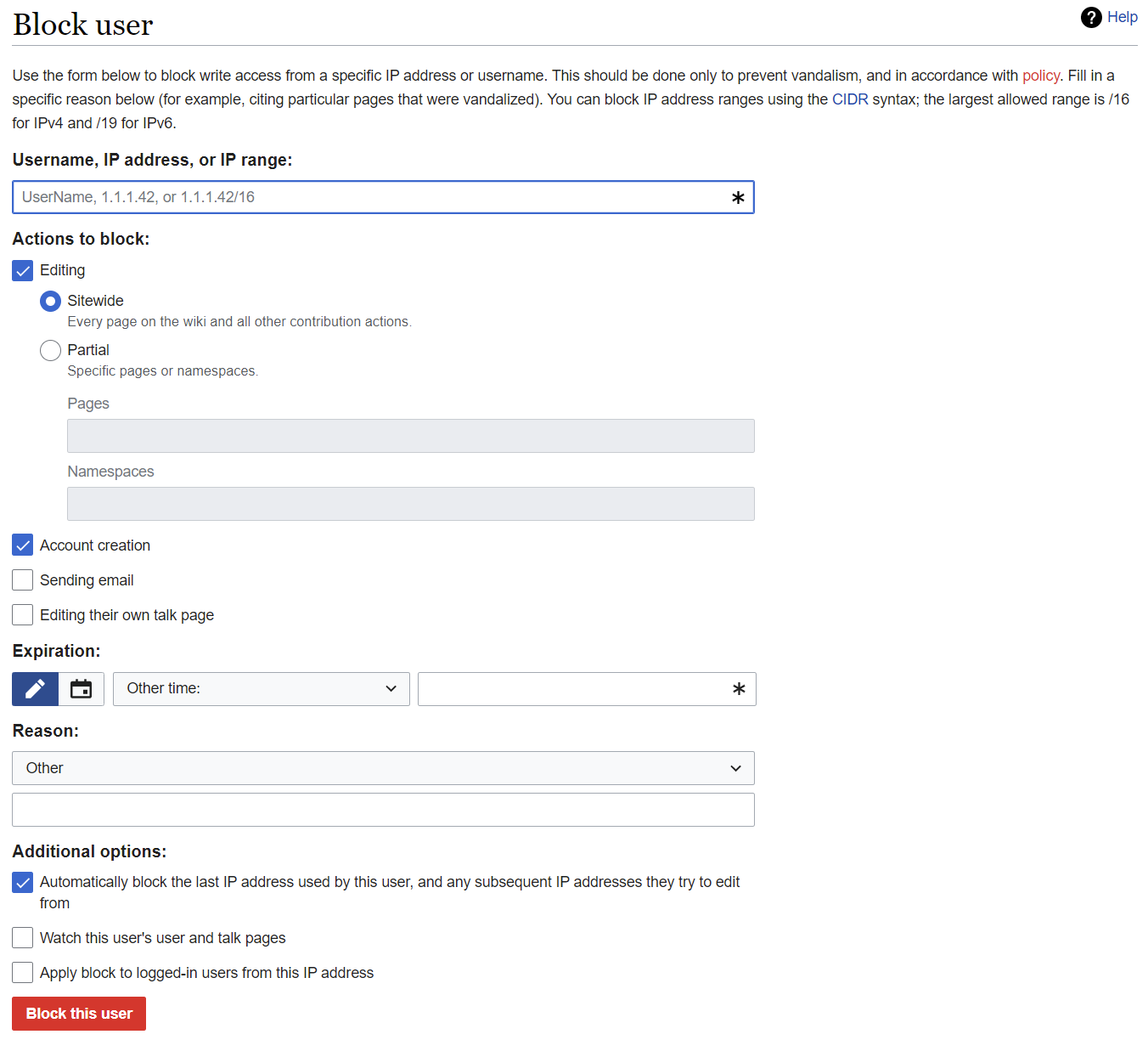 The “Expiry” field dictates how long the user will be blocked for – this can always be changed later. With spammers and egregious vandals, the best approach is to block them “Indefinitely”, i.e. forever.