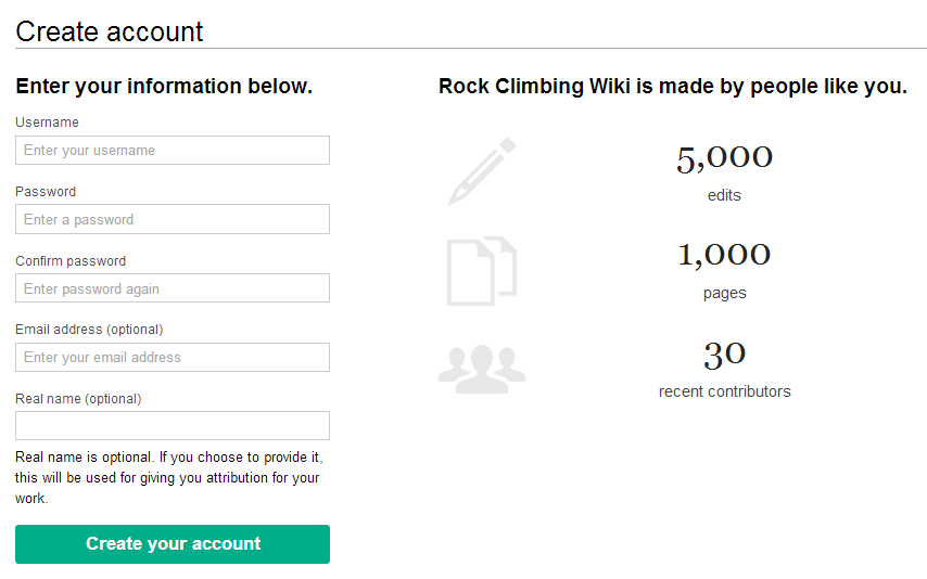 , which lets administrators, and potentially regular users as well, send out invites to other people to join the wiki, using just their email address. Invitees can then go to the site and automatically sign up, choosing their own username and password: